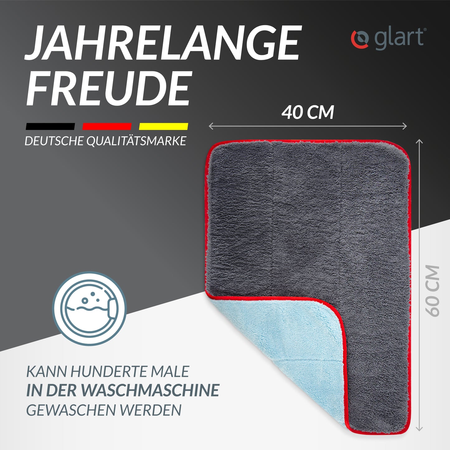 Das Glart Mikrofasertuch nimmt große Mengen Wasser auf und verkürzt die Trockenzeit deutlich. Ideal nach der Autowäsche – für glänzende, wasserfleckenfreie Lackoberflächen mit minimalem Aufwand.