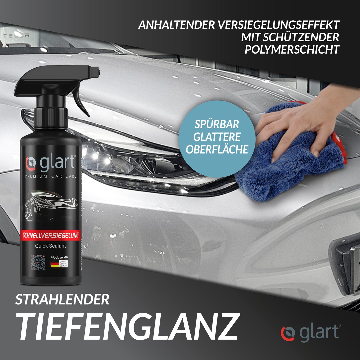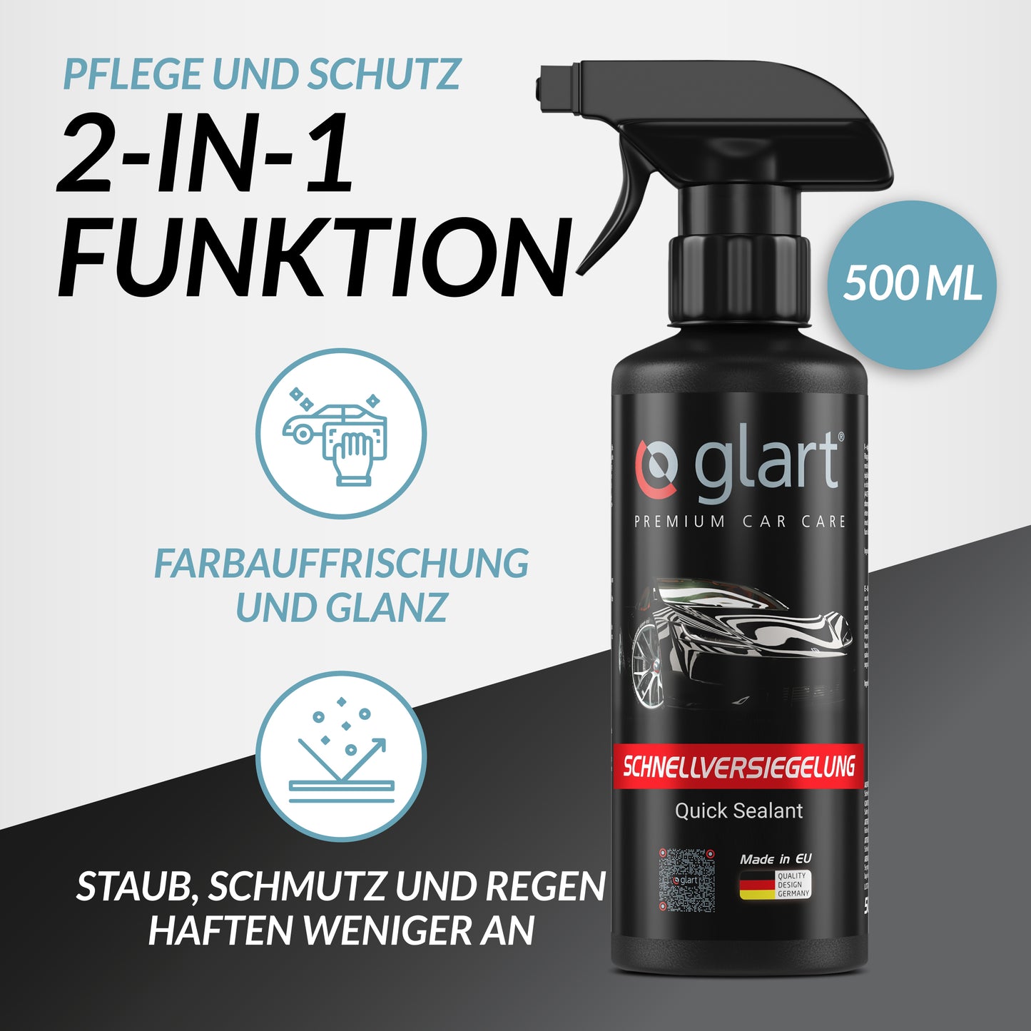 Die Glart Lack Schnellversiegelung (500 ml) bietet eine schnelle und einfache Möglichkeit, Fahrzeuglackierungen zu versiegeln und für einen tiefen Glanz zu sorgen. Die Oberfläche fühlt sich spürbar glatter an und ist vor Schmutz, Staub und Regen geschützt. Die Polymerschicht verstärkt die Farbtiefe und sorgt für einen langanhaltenden Glanz.